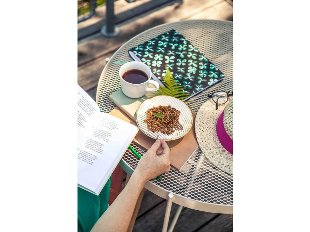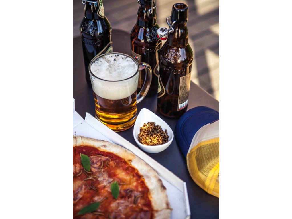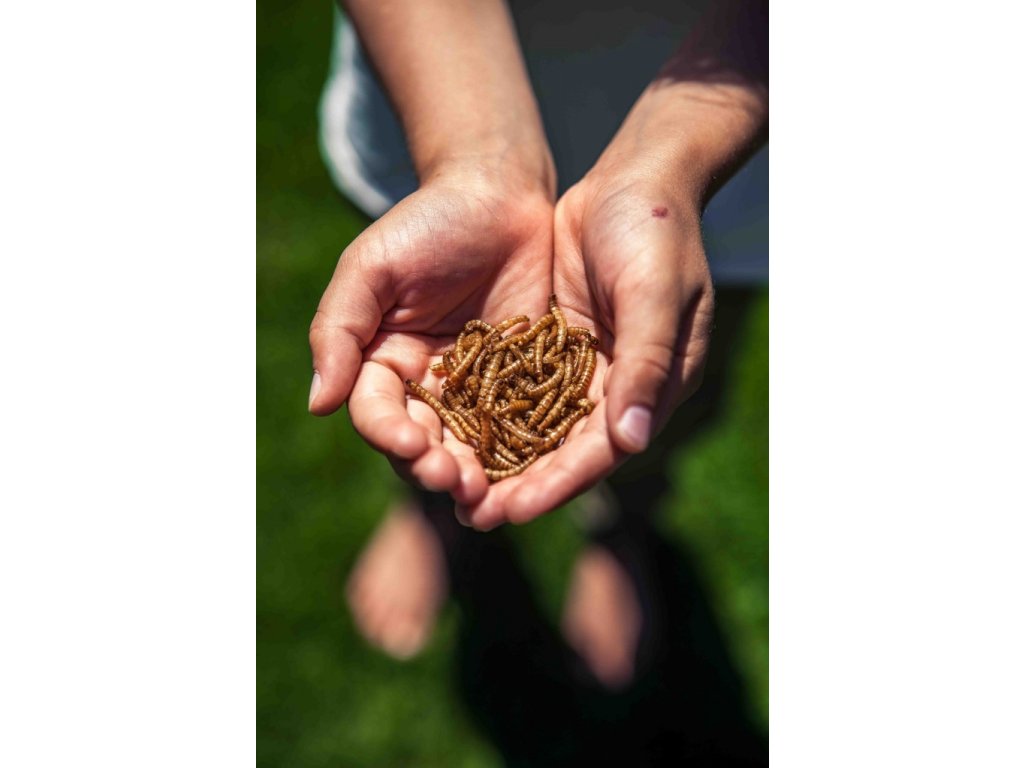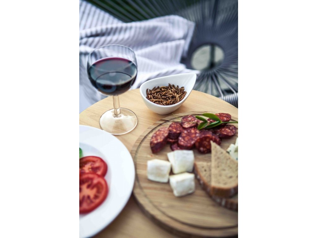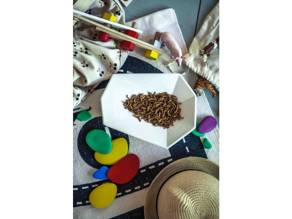 Sušené larvy potemníka moučného (Tenebrio molitor), cukr, sůl, sušená zelenina: rajčatový prášek, cibule, česnek, přírodní aroma, aroma, koření, rostlinný olej.
